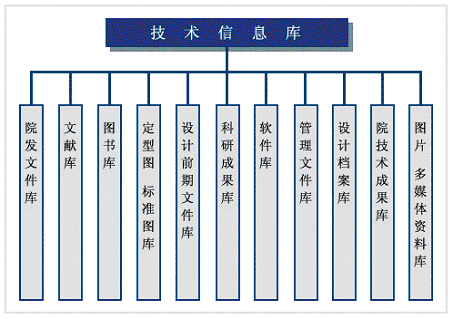 技术信息库主要包括:院发文件库、文献库、图书库、定型图标准图库、设计前期文件库、科研成果库、软件库、治理文件库、设计档案库、院技术成果库、图片多媒体资料库。